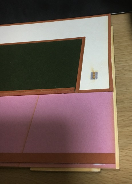 ホントは床と台座を貼りつけ、黒板側の壁と床をはめ合わせてから接着。更に、戸を挟みつつもう1枚の壁をセットし、床や黒板側の壁と貼り付けるのですが、それだとバラせなくなるのでやってません。バラす気がない人は、接着して3面をガッチリ固定しましょう。
