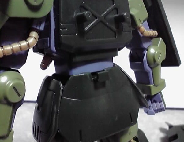 そうそう。ハイザックの後ろ腰アーマーにはラック状になっている部分があります。設定ではここがビーム・サーベルのグリップをしまうホルダーで、腰の左右に付けるミサイル・ポッドの連結部を付ける場所でもあります。たぶん、ヒート・ホークを引っ掛けることも出来ると思います。