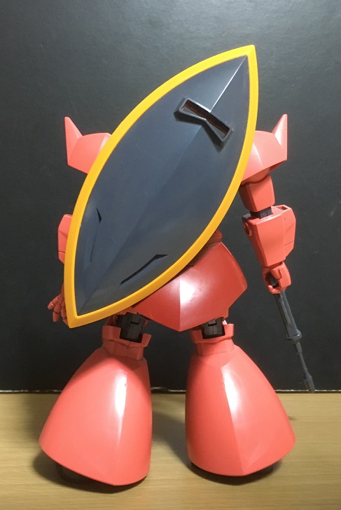「かなり大型の盾で、ゲルググ本体の大部分をガードできる程です。角度にもよるけど」