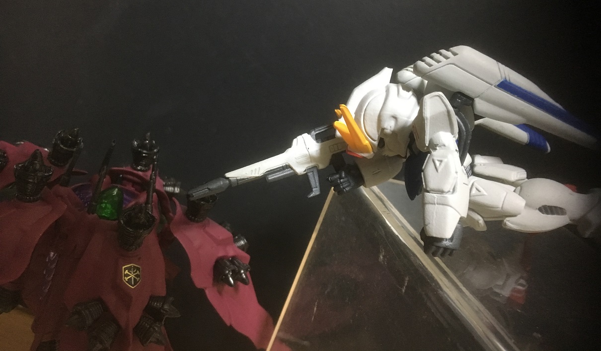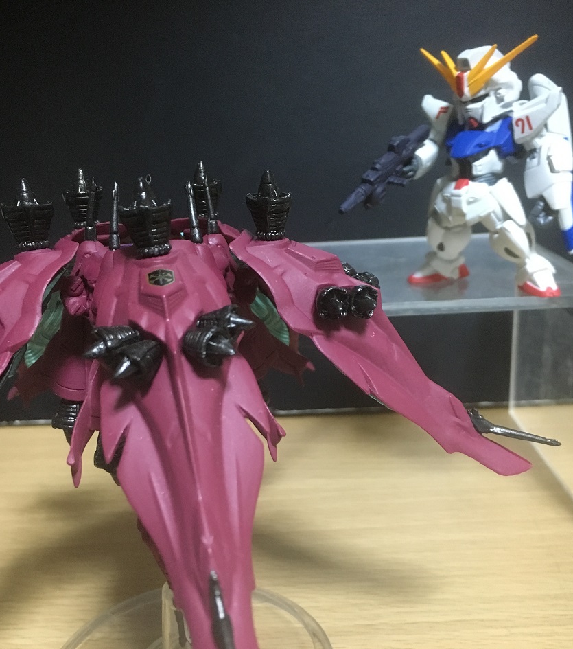 劇中ではF91にしろビギナ・ギナにしろ、鉄仮面がいる機体上側に向かって攻め込んでいました。なので戦闘シーンっぽく撮るなら、ラフレシアの上側にF91が収まるようにしたいところ。