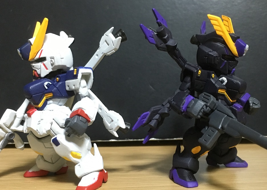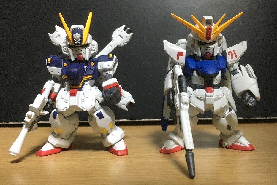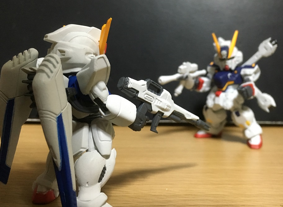 思わぬかたちで実現したクロスボーンとF91の新旧主役機対決ですが、F91の方はキンケドゥ(シーブック)がかつて搭乗していた機体そのものではなく、量産型のF91です。見た目はほとんど同じなのでオリジナルのF91に量産型の代役をしてもらっています。