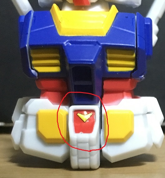 腰部ブロックの赤丸部分にシールを貼って、腰のシンボルマークがバッチリ再現。この腰部ブロックは稼働するので、奥に入り込んでいたら引っ張り出してから貼ろう。