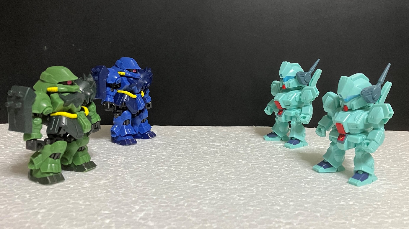 食玩「マイクロウォーズ4」(こちらをクリック)のジェガンも使って、戦闘画面っぽく。