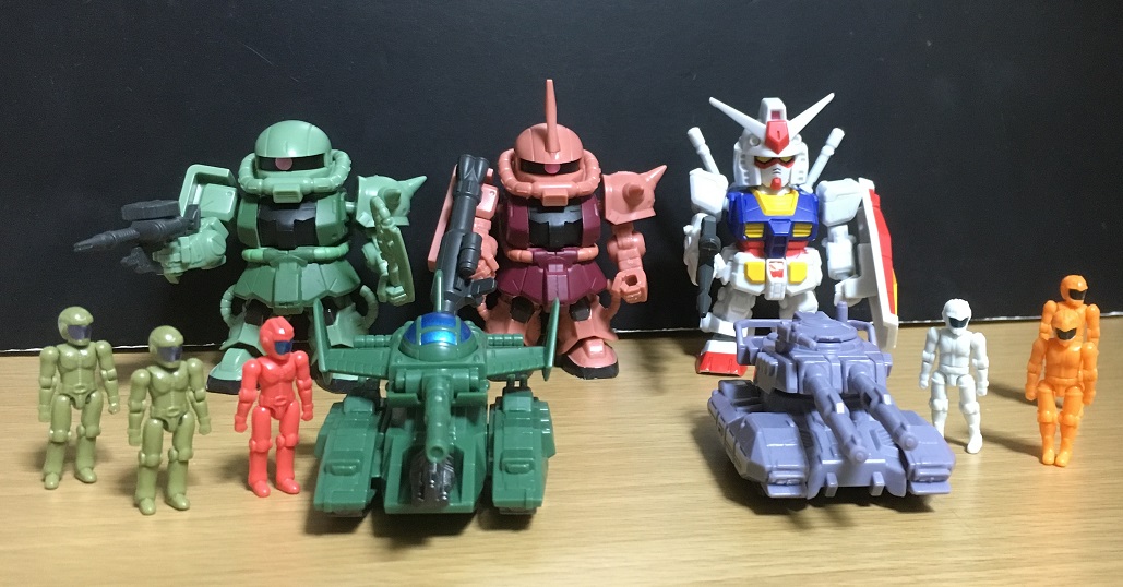 ガンダムとザク2種は定番ですが、他の2つが戦車という 攻めた ラインナップ!!