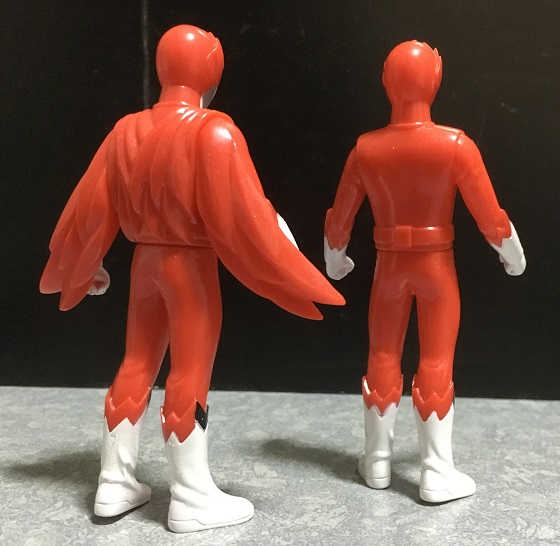 下半身のみの変更は、わりとレアなパターン。腰から下のデザインはパワーアップ後も変更なしのことも多いですし、基本棒立ちのソフビ人形では脚部にポーズ付けすることもあまり無いですから。