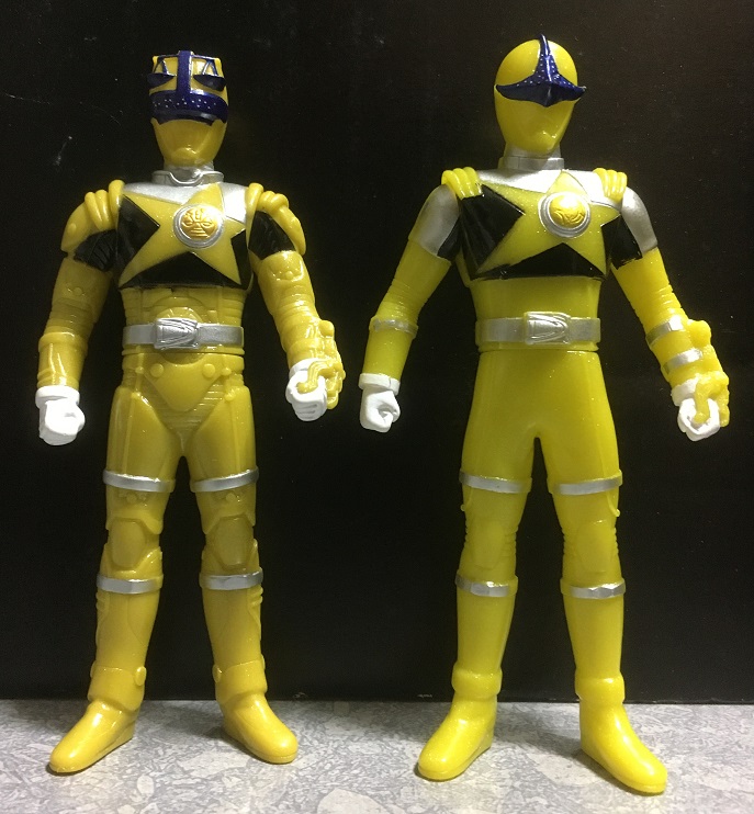 一方テンビンゴールドですが、実際のスーツだとイエローとの色の違いは明確ですが、この食玩では素材の関係で金色というより黄色寄りです。過去に販売されたゴールドの戦士は(劇中のイメージと合うかどうかはともかく)イエローとは異なる印象だったので、もう少し何とかならなかったのかと思います。
