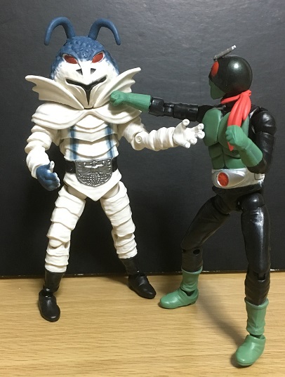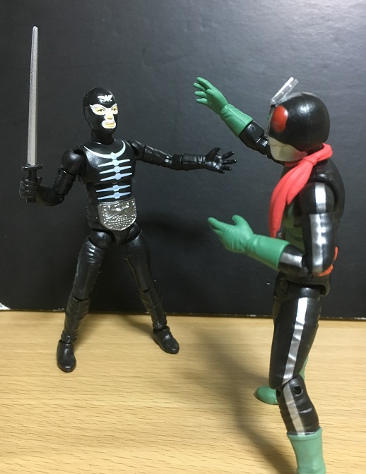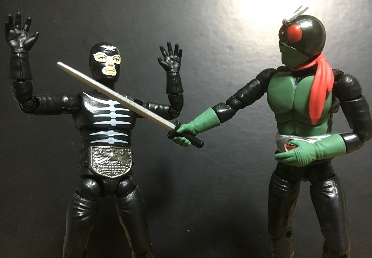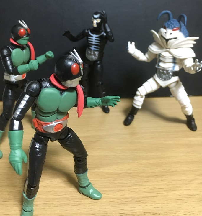 もっとも画像のショッカー戦闘員(骨)は、「2号ライダー編」では映画『仮面ライダー対ショッカー』にのみ登場。その映画では確かオートバイ部隊として登場してたと思うから、肉弾戦してた印象があまり無いのですが。う~~む。よく覚えていない(^_^;)