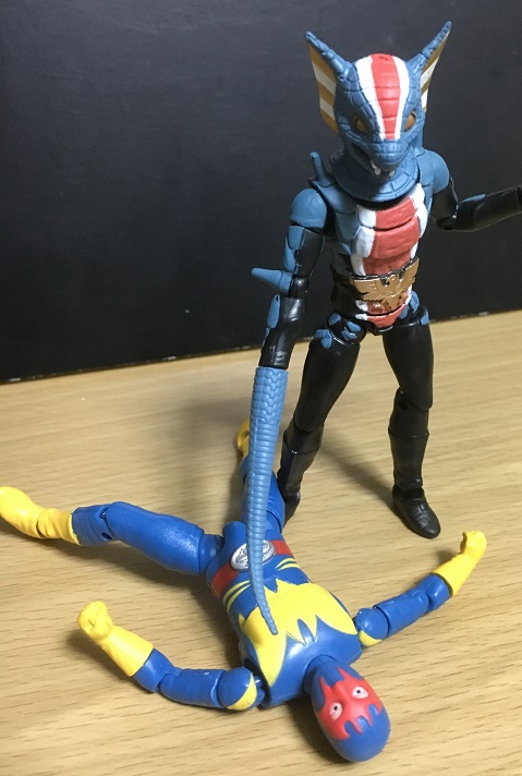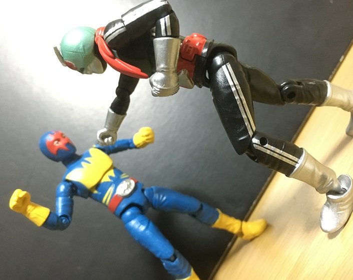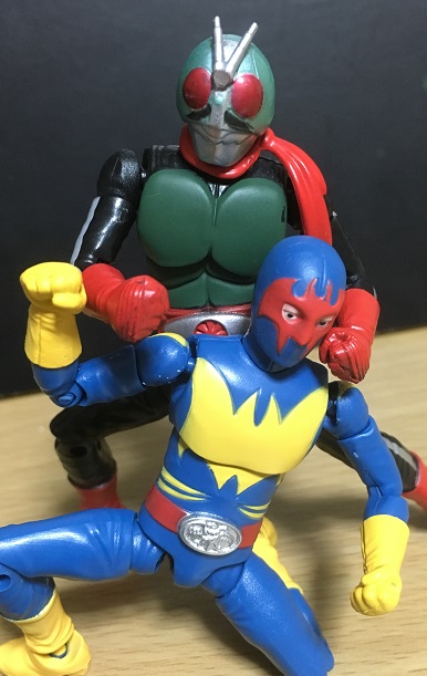 劇中ではゲルショッカー第1の怪人・ガニコウモルがショッカーの戦闘員達を、第2の怪人・サソリトカゲスが科学者達を抹殺したのですが、戦闘員同士の戦いもあったのでは? と思って↑の画像を撮ってみました。
