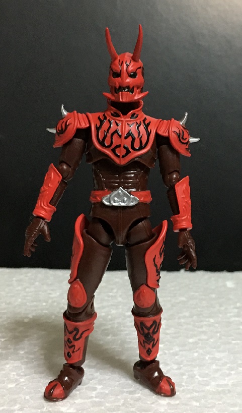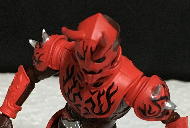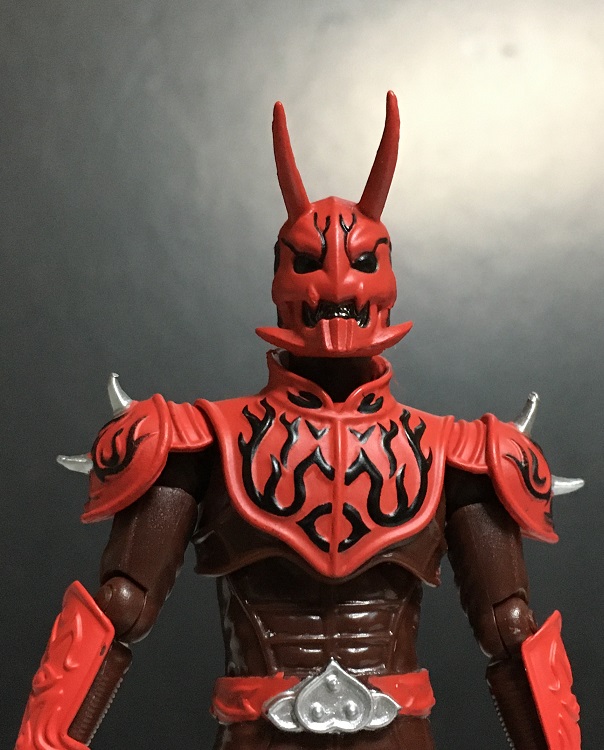 全身の赤いアーマーに入っている黒い模様は造形で再現されていますが、前腕と膝、それとベルトの模様が塗られていないのがちょっと残念。まあ、頭部や胸、肩といった目立つ箇所の模様はバッチリ塗られているので印象は悪くありませんが。