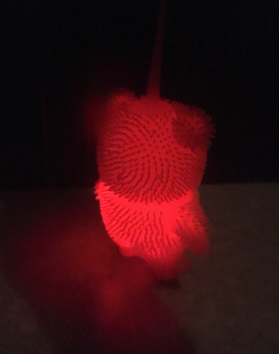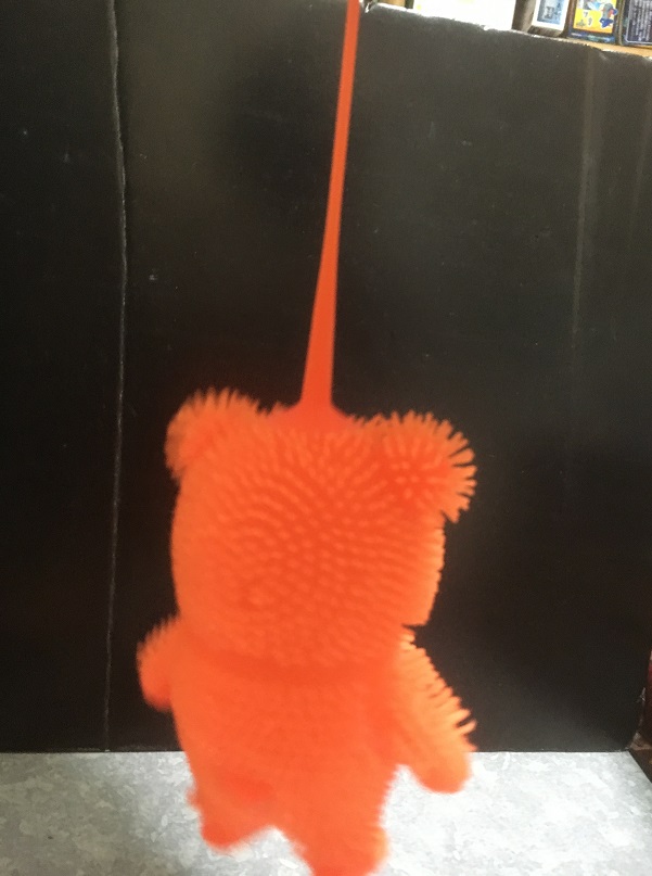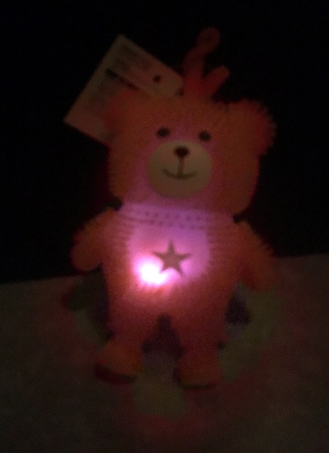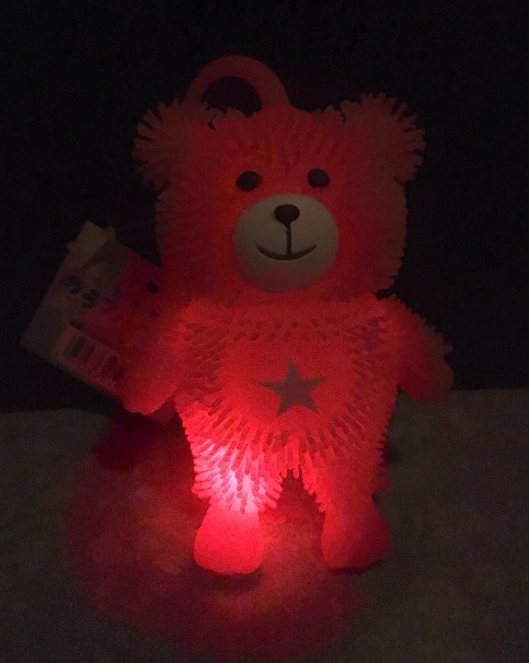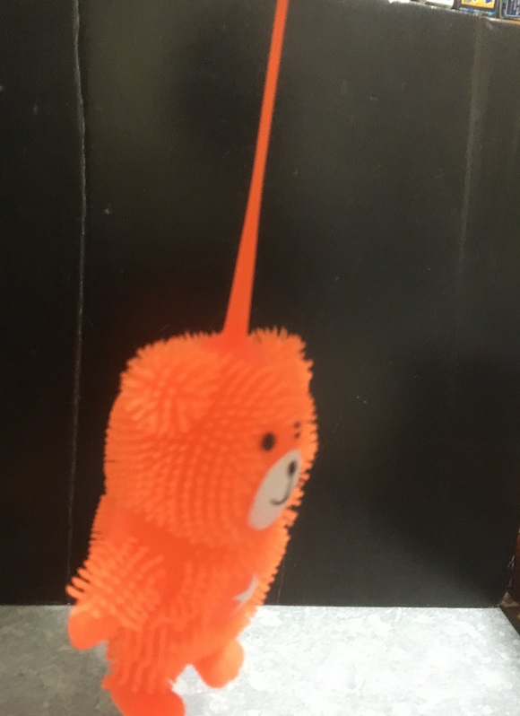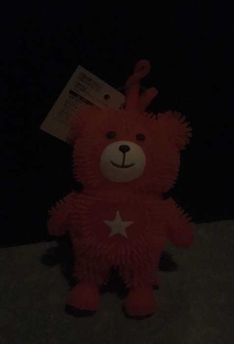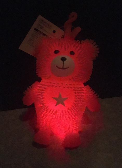 柔らか素材で出来てるクマの人形にゴム紐が付いており、ゴム紐が伸び縮みすることでヨーヨーのように遊べます。更に、地面などにぶつける等、衝撃を与えることで光ります。
