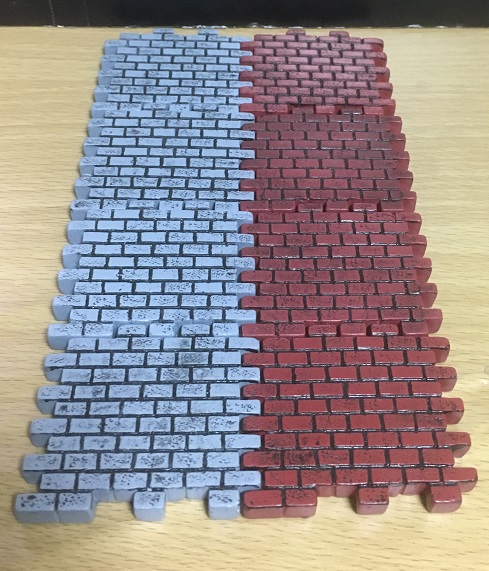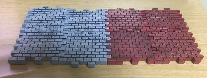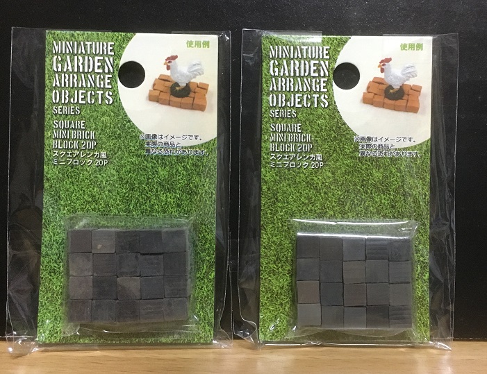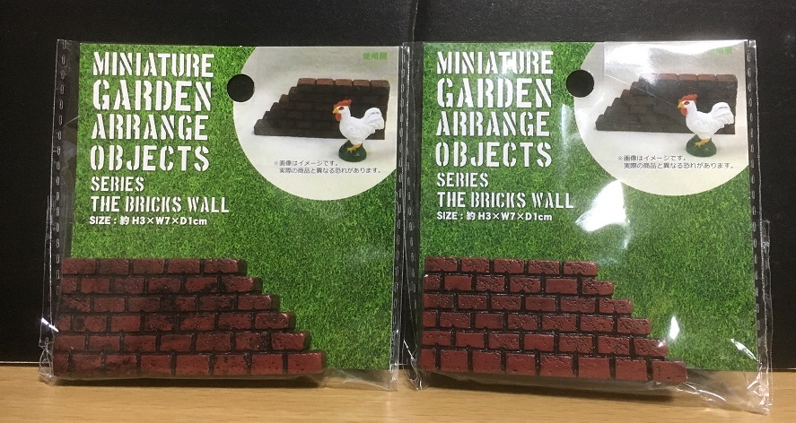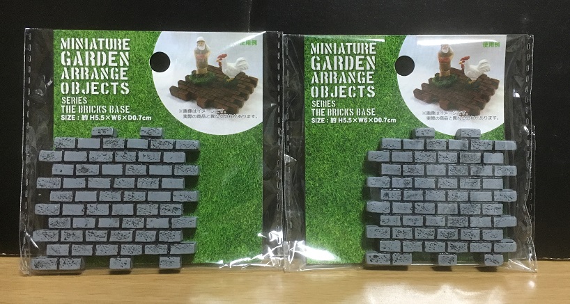 他の店舗に行ったところ、前回お見せした「ミニチュアレンガウォール」及び「ベース」の色違いを発見! それらを含めていろいろと数を増やしたので、今回は複数持ってたらできる画像を撮ってみました。あと、レンガ以外のアイテムの紹介もあります。