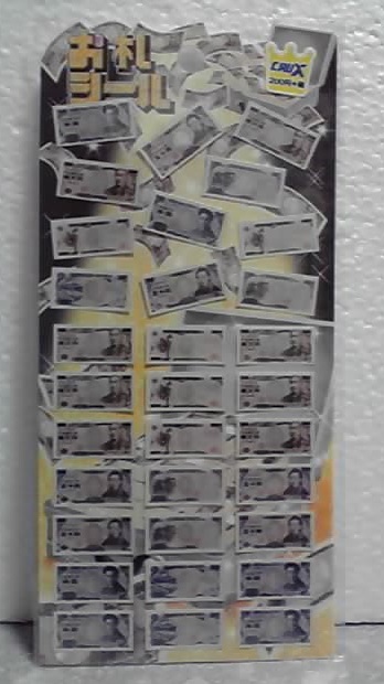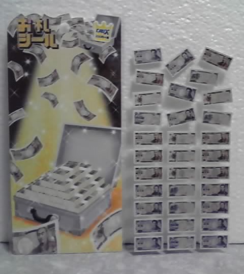 札束っぽいかたまりを作って、その表面にこのシールを貼って紙ひもで縛るのも面白いかも知れません。