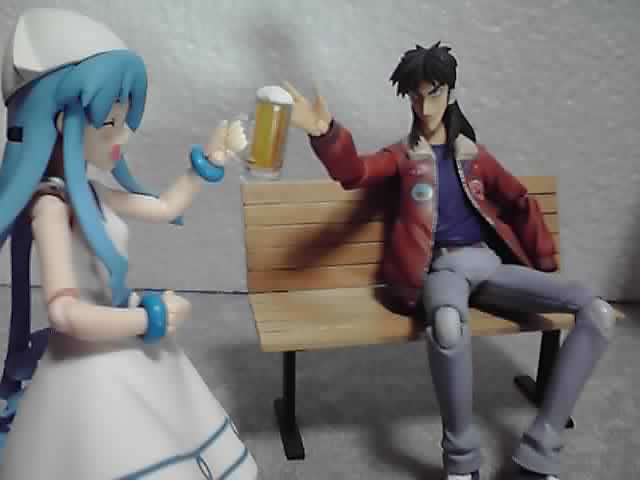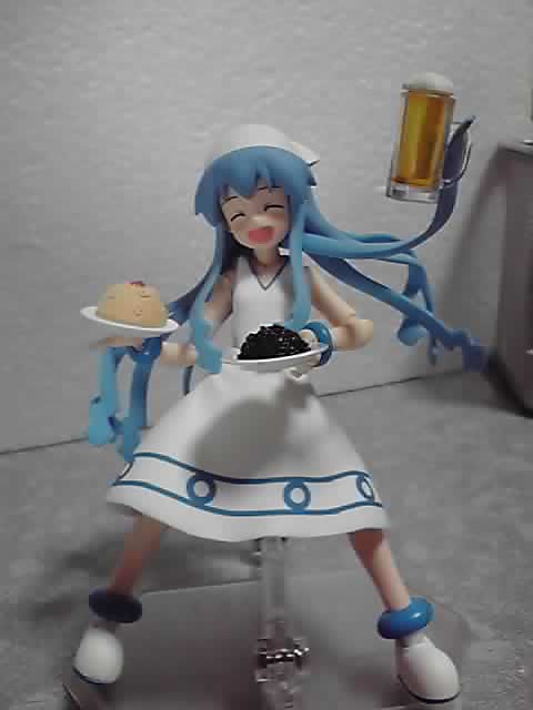 まず後ろ側にある触手を画像の位置まで持っていくまでが大変で、更にそれにビールジョッキを引っ掛け、その上で左右の手それぞれに皿を持たせます。落とさないようにバランスを取るのが難しく、実物だったら中身がこぼれそうに見える置き方もダメなので、画像の状態まで持っていくのにえらく時間がかかりました(^3^;)