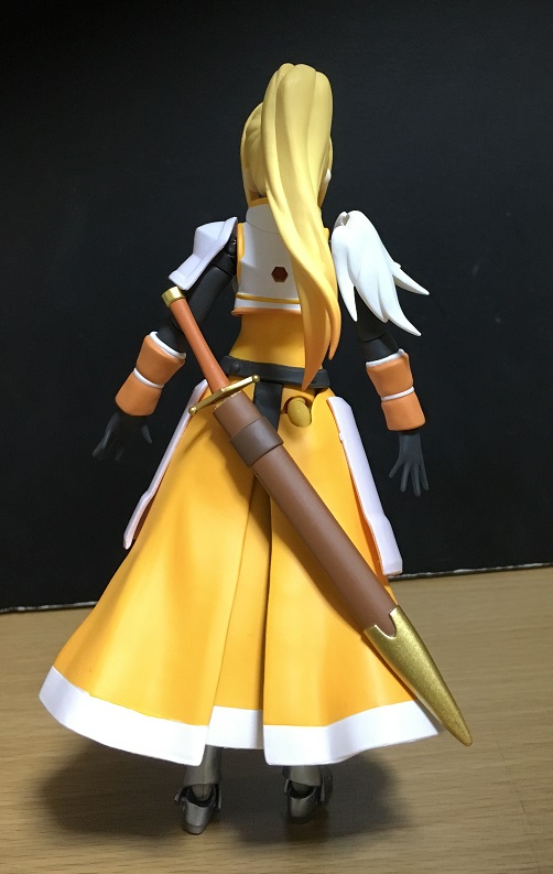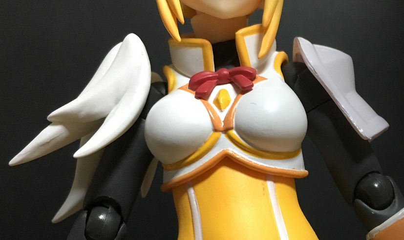 金髪と黄色の鎧の煌びやかさ、リボンがオシャレな胸アーマーと羽を思わせる形状の肩アーマーの純白、スラリとした手足を包む黒のアンダーウェアと色どりも華やか。