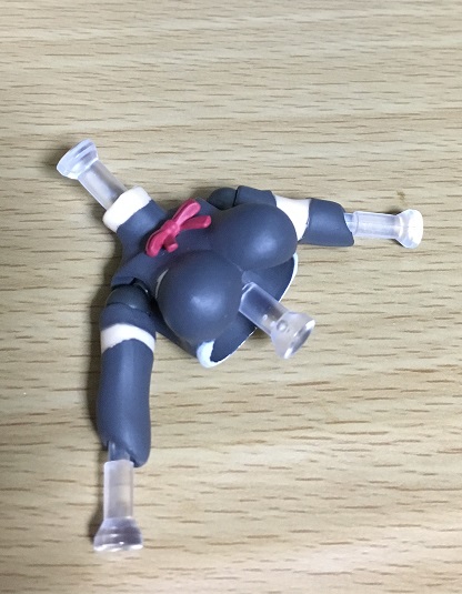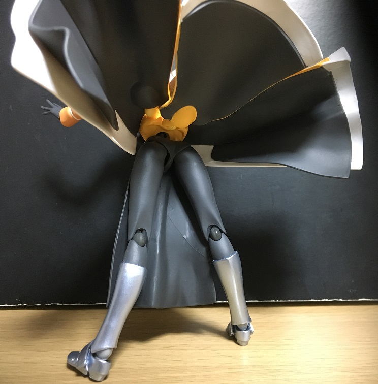 前垂れがある関係でスカート前側はめくれ上がった状態にはできませんが、軟質素材なので脚で押すようにすれば何とか。内側の黒いスカートも分割された構造なので、スリットから脚を出す感じにすればポージングの幅が広がります。