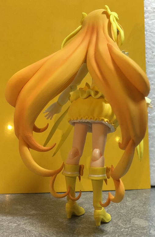 しかし今回は髪に可動軸が仕込まれていないので、ポーズを取らせる時にかなり制限されてしまいます。しかも後ろ髪が重いので、スタンドパーツ等を使わなければ、後ろに倒れそうになります。おまけに後ろ髪は細い部分が多いので、そこに引っかけて破損させないように注意しましょう。