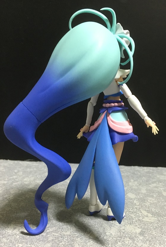 とにかく髪が長いキュアマーメイド。その為、立たせるのはバランスがとりづらいのですが、後ろ髪の先端が地面に付くので、それを支えにすることもできたり(^^;)