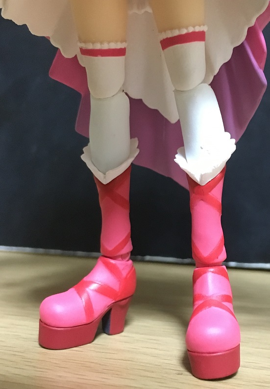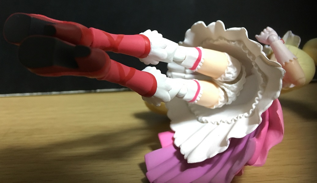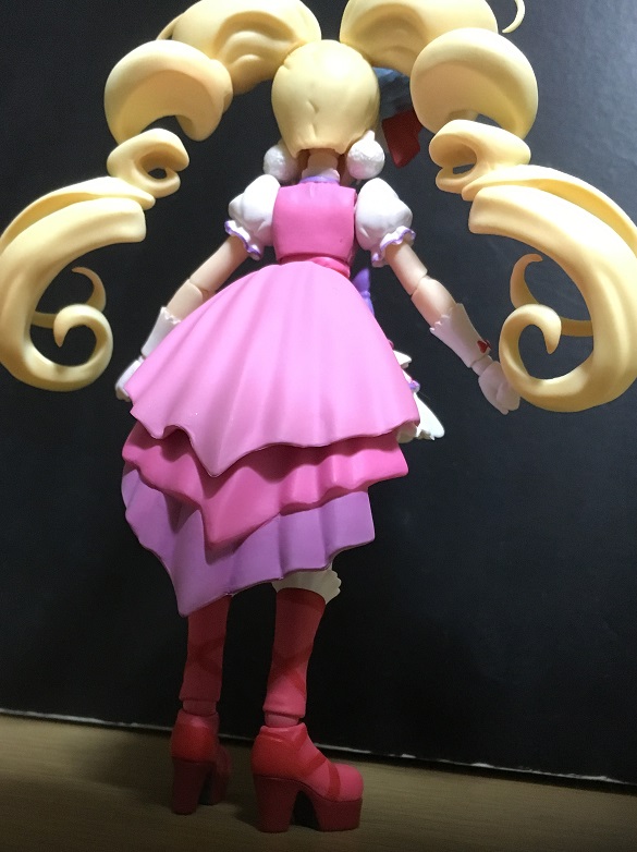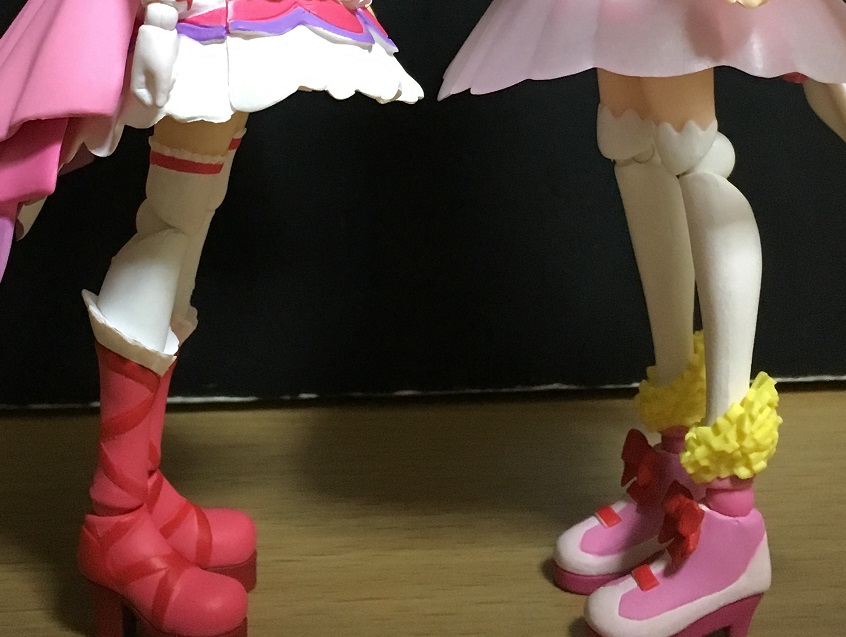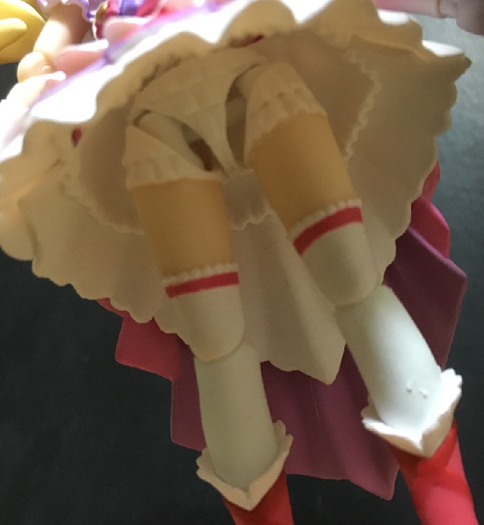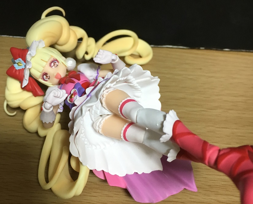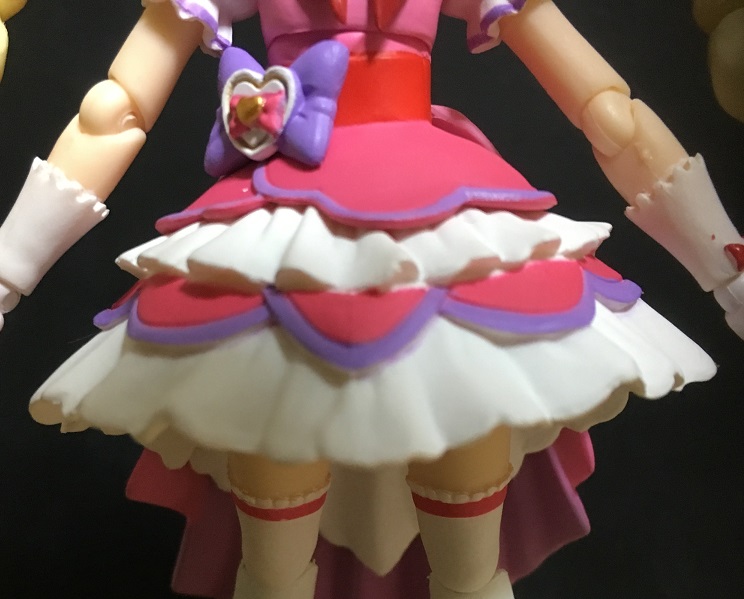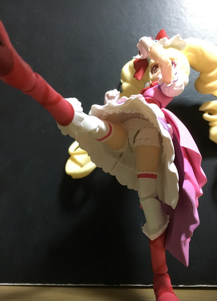 背面側ほどの長さはないので、脚を前に動かす際にあまり干渉はしません。まあ実際のスカート(といってもプリキュアのスカートは布でできてるかは怪しいですが)みたいに形状が変わるわけではないのですが、工夫すればポージングの幅は広がります。