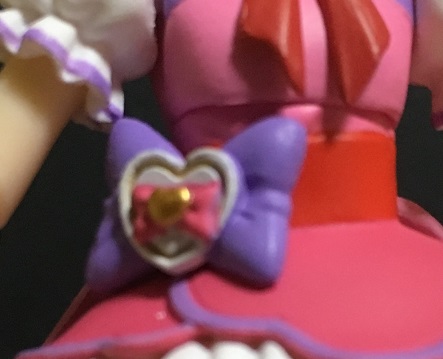 変身アイテム「プリハート」入ったポシェットで、他の4人と違いマシェリのみ右腰に付いています。これは頭のリボン飾りと同じく、同時加入となったキュアアムールと対称的に見せる意図があってのことと思われます。向き合っている時に目立つアイテムの有無が一緒になりますし。