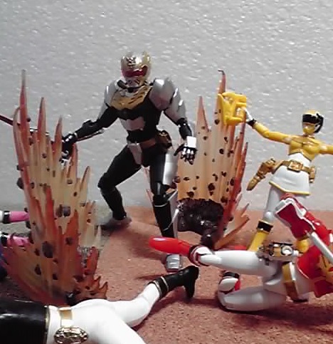 敵の激しい攻撃でゴセイジャー達が吹っ飛ばされても、1人大地を踏み締めて耐えきる姿です。