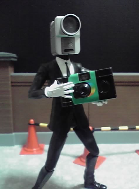 ビデオカメラそのまんまな頭とクネクネした怪しい動きをしながら盗撮している映画泥棒の姿はインパクト抜群!!