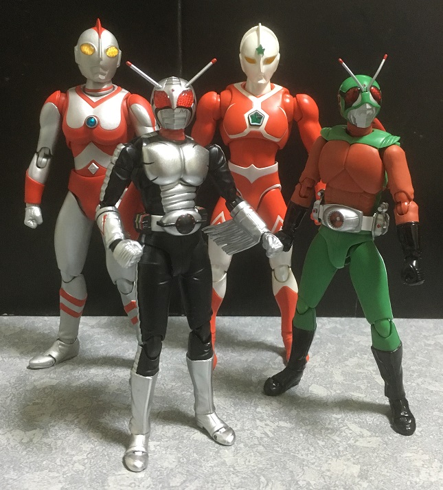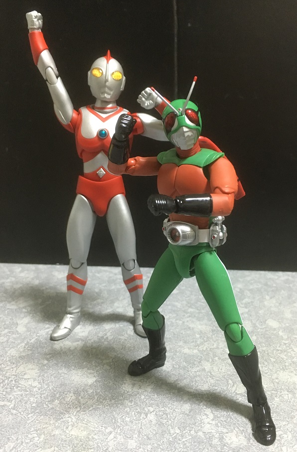 →『ザ☆ウルトラマン』よりULTRA-ACT ウルトラマンジョーニアス(アニメver.)と、←『仮面ライダー(新)』よりS.H.Figuarts 強化スカイライダーです。(※後者は正確にいうと、番組名は『仮面ライダー』、商品名は「S.H.Figuarts スカイライダー」なのですが、それだと他のものと区別がつけづらいので前述の書き方をしています)