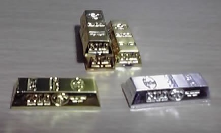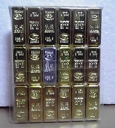 金塊の形状は2種類あり、それに金メッキと銀メッキの違いがあるので全部で4種類みたいです。中古ショップで、24本入りで108円。2セット買いました。ゲーセンの玩具を掬うゲームに入ってる物だと思われます。S.H.Figuarts.の両さんに持たせて一攫千金!とか、ショッカー戦闘員に運ばせるとか、使い道はいろいろありそうです(^^)